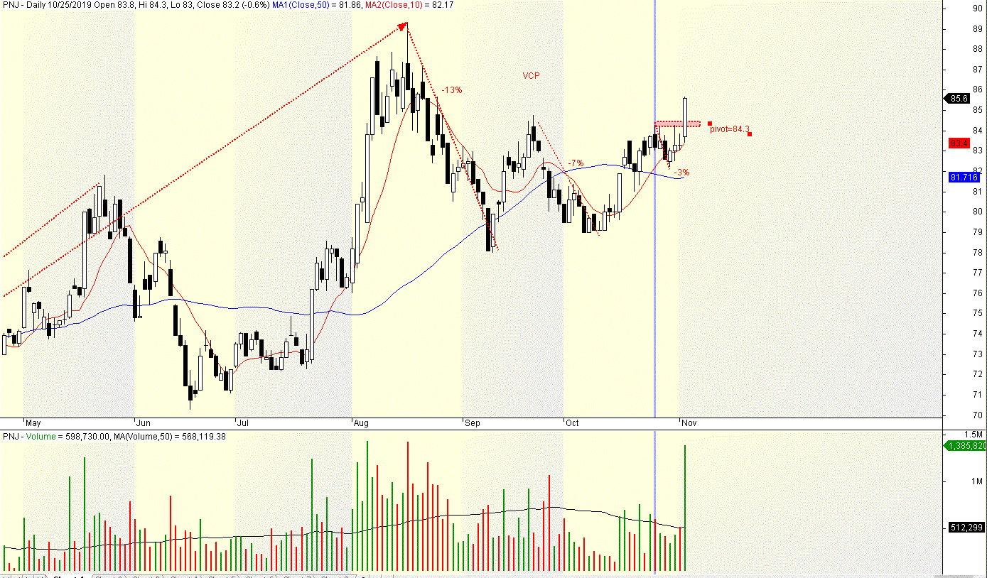 Cổ phiếu PNJ có điểm mua theo điểm breakout của mô hình VCP của phù thủy Mark Minervini