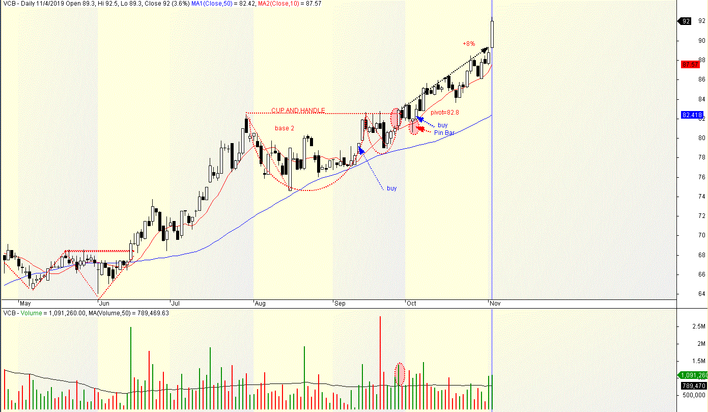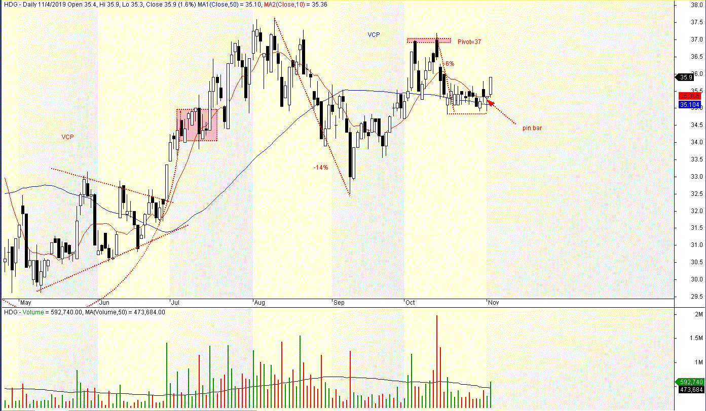 HDG đang vận động theo mô hình VCP với hai vòng thu hẹp. Điểm mua ngày 4.11.2019 vừa là PK Techniques vừa là theo cây pin bar