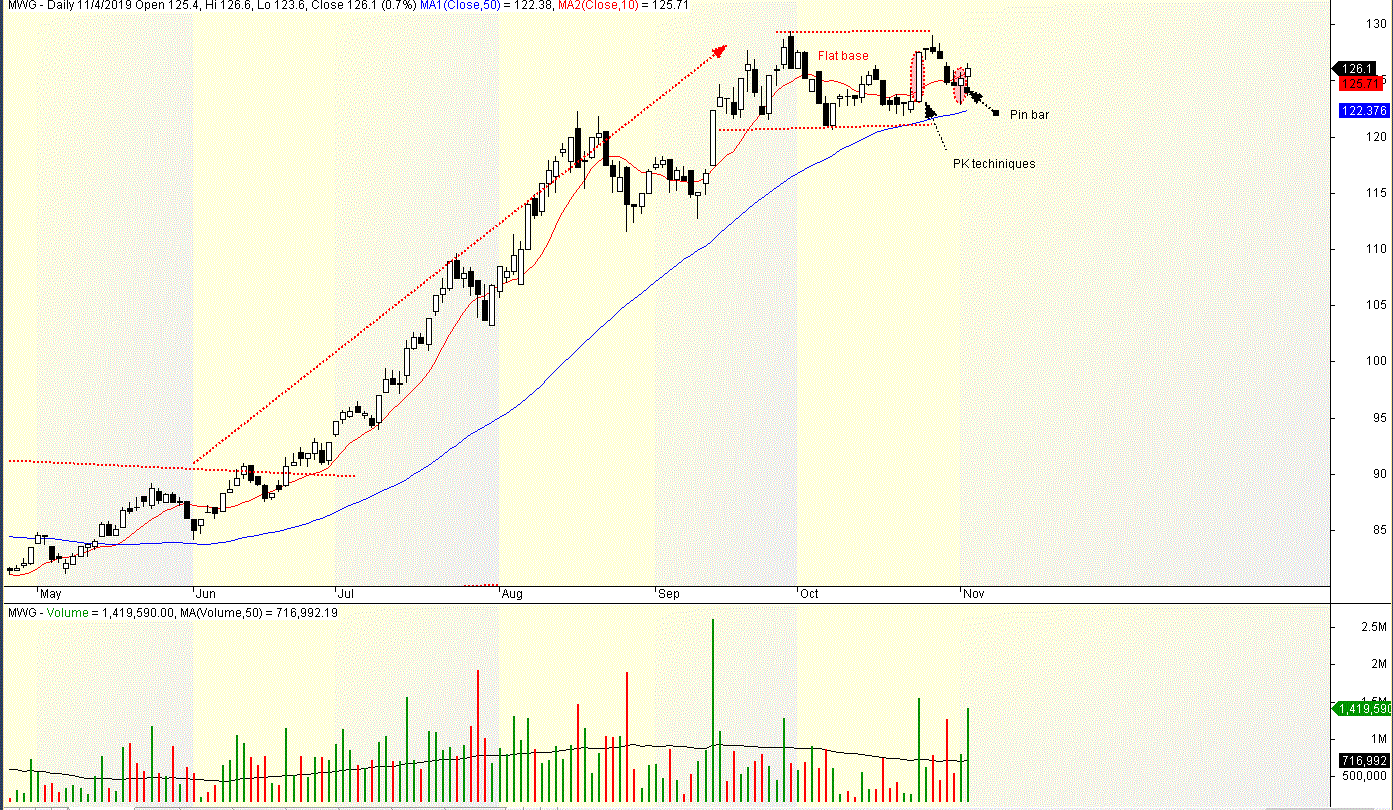Cổ phiếu MWG như nhận định trong bản tin ngày hôm trước có điểm mua theo tín hiệu pin bar. Không những thế, phiên giao dịch ngày 4.11.2019 tiếp tục là một cây pin bar khác