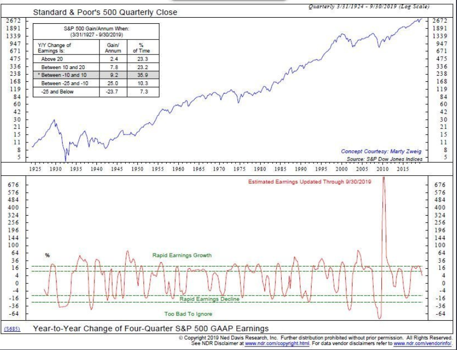 The S&P 500 does best when earnings are moderately strong or NEGATIVE; accept when sub 25%. The market will discount a recession but not a depression. Sometimes the biggest move comes AFTER eps peak. S&P earnings are slowing, but the long consolidation has likely discounted it.