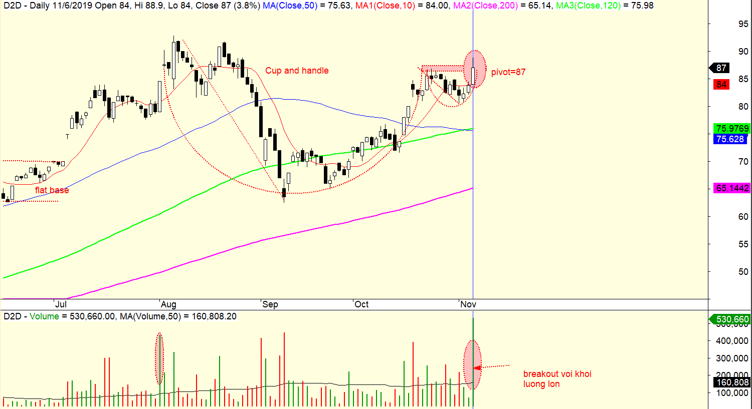 Cổ phiếu D2D có điểm breakout mô hình Chiếc Cốc- Tay Cầm.