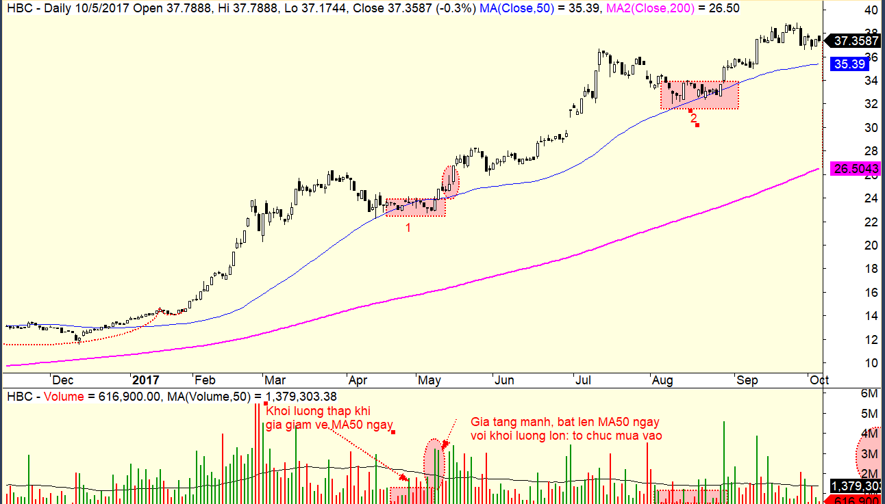 HBC từng là cổ phiếu hoa hậu thời 2016-2017. Bạn thấy đấy việc giá giảm khi tiệm cận đường MA50 ngày với khối lượng thấp nhưng sau đó bật tăng mạnh với khối lượng lớn được lặp lại tại điểm số 1 và số 2. Đó là những lúc bạn biết rằng nhà đầu tư tổ chức nhảy vào mua để hỗ trợ giá cổ phiếu.