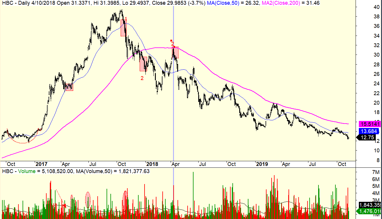 Năm 2017, tôi thoát khỏi HBC trước khi cổ phiếu này sụp đổ bằng quy tắc cực kỳ đơn giản nhưng hiệu quả này. Điểm số 1 đánh dấu việc HBC phá thủng MA50 ngày với khối lượng lớn và điểm số 2 đánh dấu giá giảm mạnh phá thủng MA200 ngày với khối lượng lớn. Quy tắc này giúp tôi tránh khỏi các rắc rối khi mua các cổ phiếu bị các nhà đầu tư tổ chức bán tháo và bước vào xu hướng giảm.