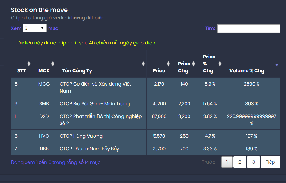 Ví dụ, 1 cổ phiếu giao dịch bình quân 1 triệu đơn vị mỗi phiên. Giá có thể tăng hoặc giảm một chút trong một ngày với thanh khoản quanh mức 1 triệu thì chẳng có chuyện gì quan trọng xảy ra cả. Nhưng nếu giá bất ngờ tăng 5% với khối lượng đạt mức 3 triệu đơn vị thì đó là đột biến lớn. Trên trang chủ của CANSLIM Vietnam, chúng tôi luôn để mục Stock On The Move, để giúp nhà đầu tư biết được mã cổ phiếu tăng có mức tăng giá trên 2% với khối lượng tăng đột biến, như là một cách dễ dàng nhất để quan sát dòng tiền tổ chức đang tập trung vào mã cổ phiếu nào mỗi ngày. Tôi quan sát Stock On The Move mỗi ngày.
