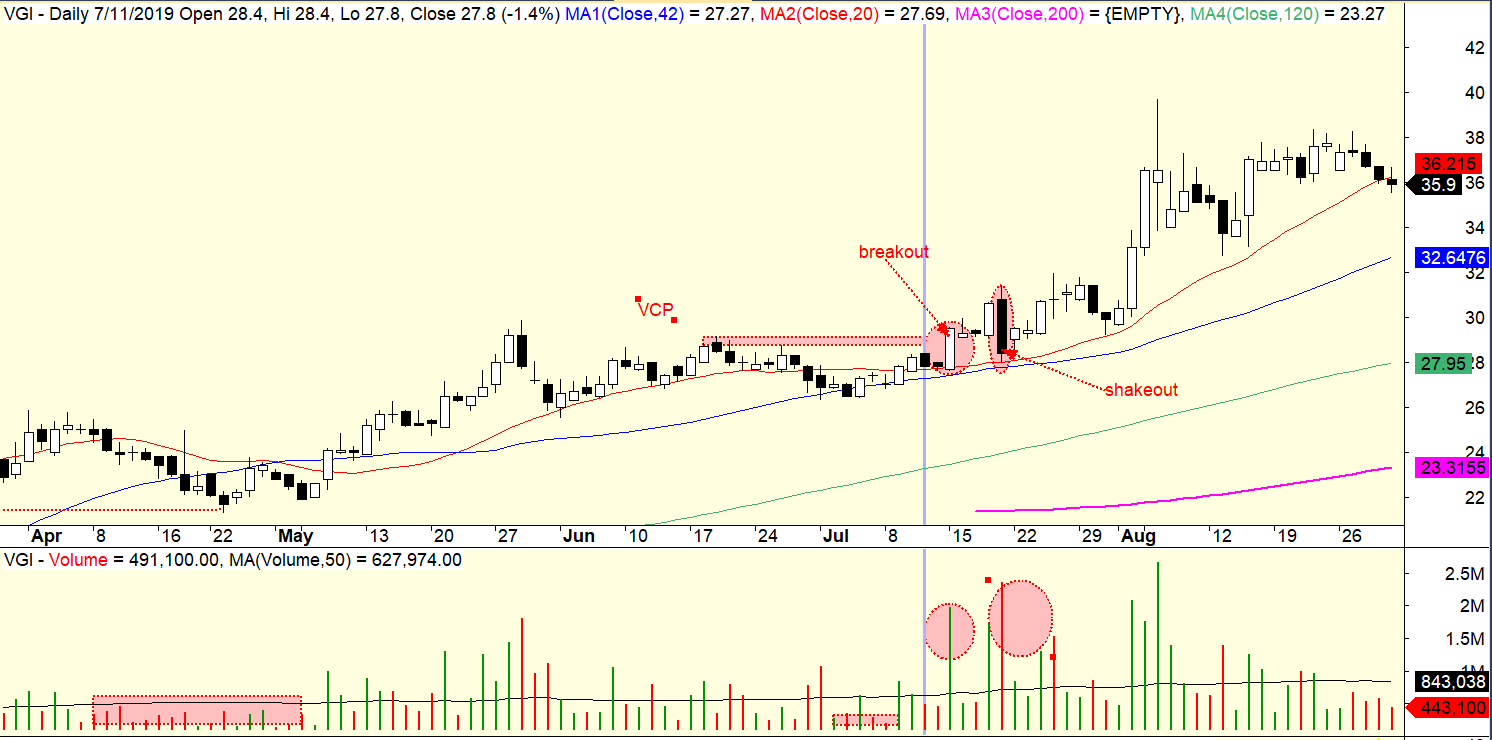 Hẳn bạn đọc còn nhớ cú rủ bỏ của VGI vào tháng 7/2019. Ngày 15/7/2019, VGI có phiên breakout (phá vỡ) thoát khỏi mẫu hình VCP mà chúng tôi theo dõi. Tôi mua ở phiên giao dịch này khi nhân thấy khối lượng tại điểm breakout rất thuyết phục. Chỉ khoảng 4 ngày sau, cổ phiếu VGI có cú bán tháo vào cuối phiên, giá chạm vào MA20 ngày và gần sát MA50 ngày với khối lượng lớn. Cú đạp mạnh đi kèm với khối lượng còn lớn hơn cả ngày breakout
