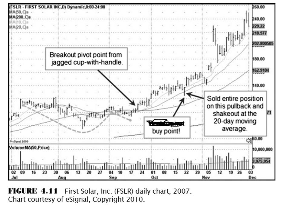Ngày nay tôi sử dụng quy tắc phải chờ giá đóng cửa phá thủng MA20 ngày trước khi bán, vì các cổ phiếu mạnh có thể đảo chiều tăng trong ngày và đóng cửa trên MA20 ngày. Nếu tôi có quy tắc này, tôi đã có thể nắm giữ FSLR vào ngày 22 tháng 10 năm 2007. Không kể MA20 ngày hay MA50 ngày, tôi không xem chúng là mức giá “cứng” mà là trung bình của một “vùng giá” và xem phản ứng của giá cổ phiếu quanh đường trung bình. Các cổ phiếu thường chui xuống dưới đường trung bình di động trong ngắn hạn, ví dụ như trong ngày, hoặc thậm chí 1-2 ngày, trước khi vượt trở lại lên trên đường trung bình di động. Chắc chắn nhiều nhà giao dịch sẽ đánh rơi hàng khi nhìn thấy giá bị bán thủng đường trung bình di động. Do đó, bạn phải quan sát hành động giá/khối lượng quanh đường trung bình di động để chắc chắn đó không phải là tình huống rũ bỏ. Ngày này, quan điểm của tôi cho rằng đường trung bình di động và các mức hỗ trợ thực ra là mức trung bình hoặc điểm giữa của một vùng hỗ trợ (hoặc kháng cự). Ngoài ra, một khi giá cổ phiếu lần đầu tiên phá thủng đường trung bình di động, ví dụ như MA20 ngày, thì bạn phải có sự xác nhận “vi phạm” của đường trung bình di động bằng cách thấy giá ở các phiên sa phá thủng đáy thấp nhất của ngày đầu tiên nằm dưới đường MA20 ngày. Điều này có thể áp dụng cho mọi khung thời gian của đường trung bình di động, bằng cách định nghĩa “sự vi phạm” là khi giá phá thủng đáy thấp nhất của ngày đầu tiên giá đóng cửa nằm dưới đường trung bình di động, vì hành động giá của một ngày không đủ để xác nhận sự vi phạm.