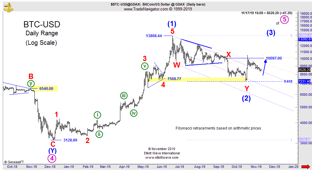 Cấu trúc sóng Elliott hiện tại cho Elliott. Cấu trúc sóng Double Zigzag W-X-Y đã hoàn tất. Điều này mở ra khả năng tăng giá lên mốc 10,000. Nếu vượt qua ngưỡng tâm lý này, sóng (3) sẽ diễn ra với mục tiêu 18,000.