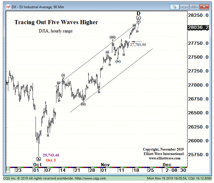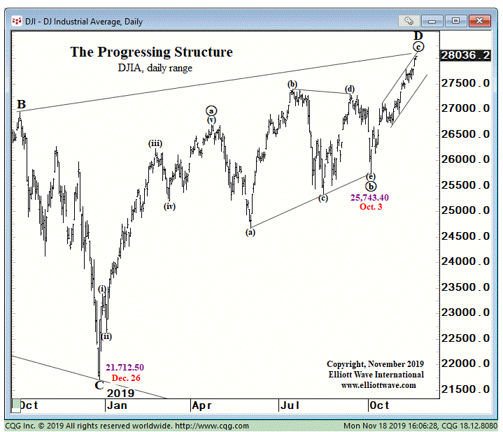 Về tổng thể, cấu trúc sóng Elliott của Dow Jones theo đồ thị ngày là như sau. DJIA đang ở sóng c (vòng tròn) của sóng D.