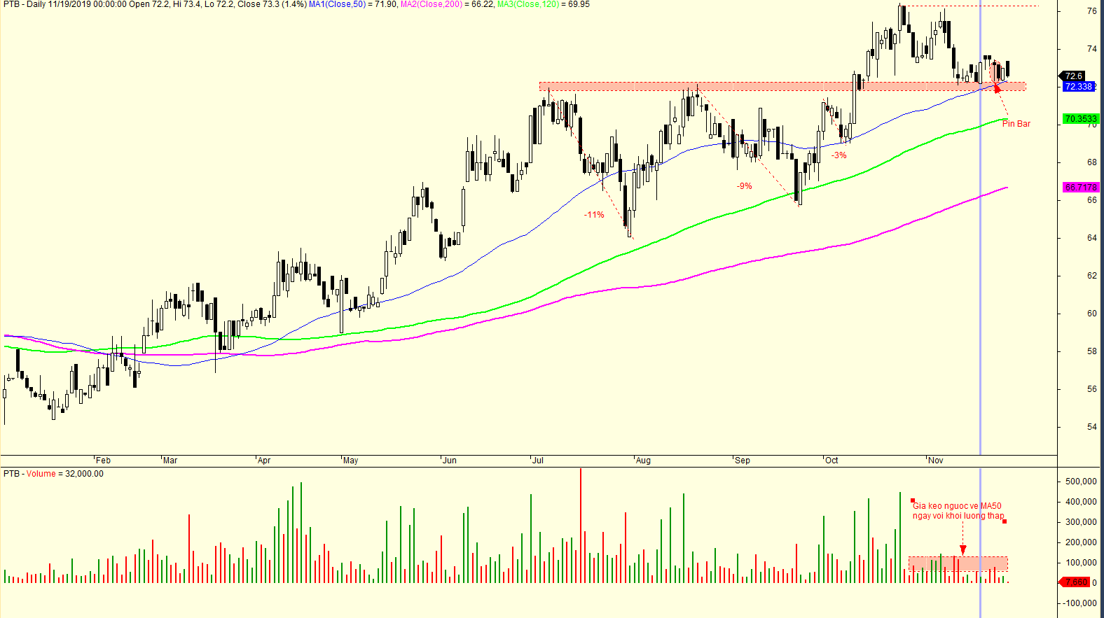 Trên đồ thị giá. PTB đang có chiến lược ” Giá kéo ngược về MA50 ngày với khối lượng thấp”. Vùng giá 72 là ngưỡng hỗ trợ mạnh cho PTB tạo bởi MA50 ngày và đỉnh cũ nay trở thành hỗ trợ.