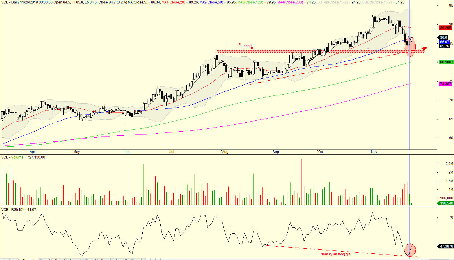 • VCB kéo về MA50 ngày và đóng có phiên bị tuột ra ngoài dãi băng dưới của Bollinger Band.