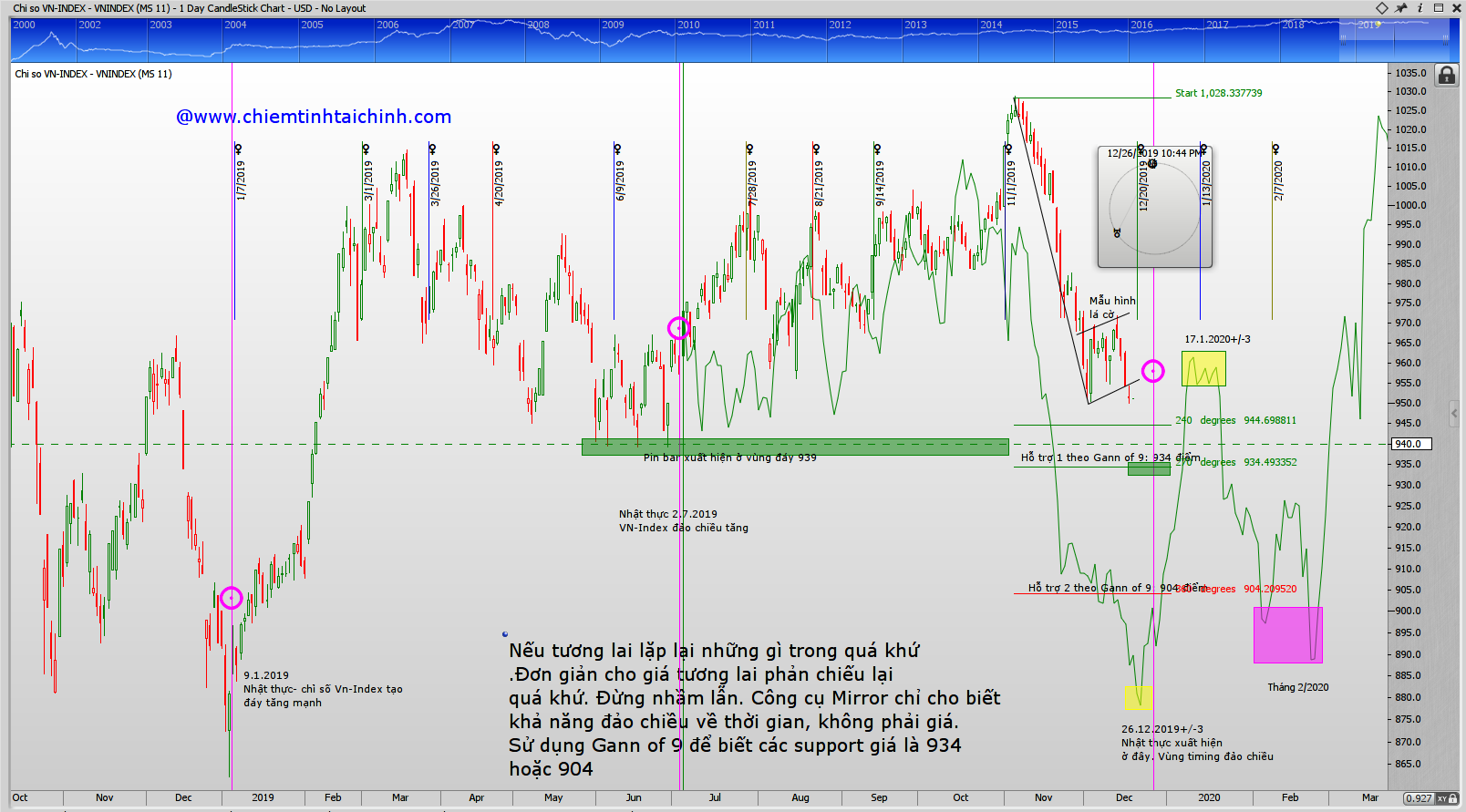 Đường màu xanh (Green) là công cụ mirror (cái gương phản chiếu), tức chúng ta xem ngày 2/7/2019 như là cái gương và soi lại diễn biến giá quá khứ để xem các điểm thời gian đảo chiều. Lưu ý, nó không dự phóng giá mà là timing. Các ngày quan trọng là 20/12 +/-3 TD, 17/1/2020 +/-3 TD.