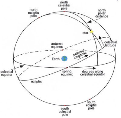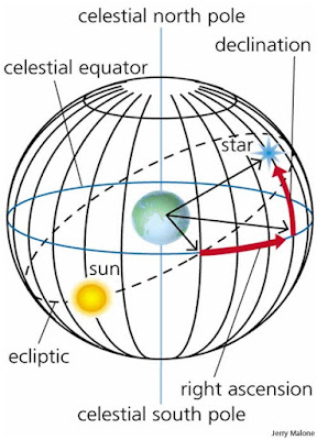 Chúng ta còn làm quen với hai khái niệm khác là Right Ascension và Declination (độ nghiêng). Right Ascension đo lường khoảng cách từ điểm xuân phân đến vị trí tương ứng của ngôi sao trên đường xích đạo thiên văn (celestial equator). Right Ascension đi kèm với Declination. Declination cho biết vị trí của một ngôi sao nằm ở phía Bắc hoặc phía Nam so với đường xích đạo thiên văn (celestial equator). Chú ý, không nên nhầm lẫn với Latitude (vĩ độ) cho biết vị trí của một ngôi sao nằm ở phía Bắc hay phía Nam so với đường hoàng đạo (Ecliptic).