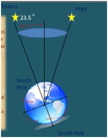 (Một chút ngoài lề về thiên văn học: Hiện tượng được được gọi là “sự thay đổi của điểm xuân phân (Precession of the Equinoxes” xảy ra vì trục trái đất nghiêng 23 độ khi nó quay vòng quanh trái đất. Giống như một đỉnh xoay vòng, trái đất lắc lư nên hướng tới một ngôi sao phương bắc khác nhau. Hiện tại, ngôi sao phương Bắc của chúng ta là Polaris nhưng cách đây 12,200 năm trước công nghiêng, ngôi sao phương bắc của chúng ta là Vega.