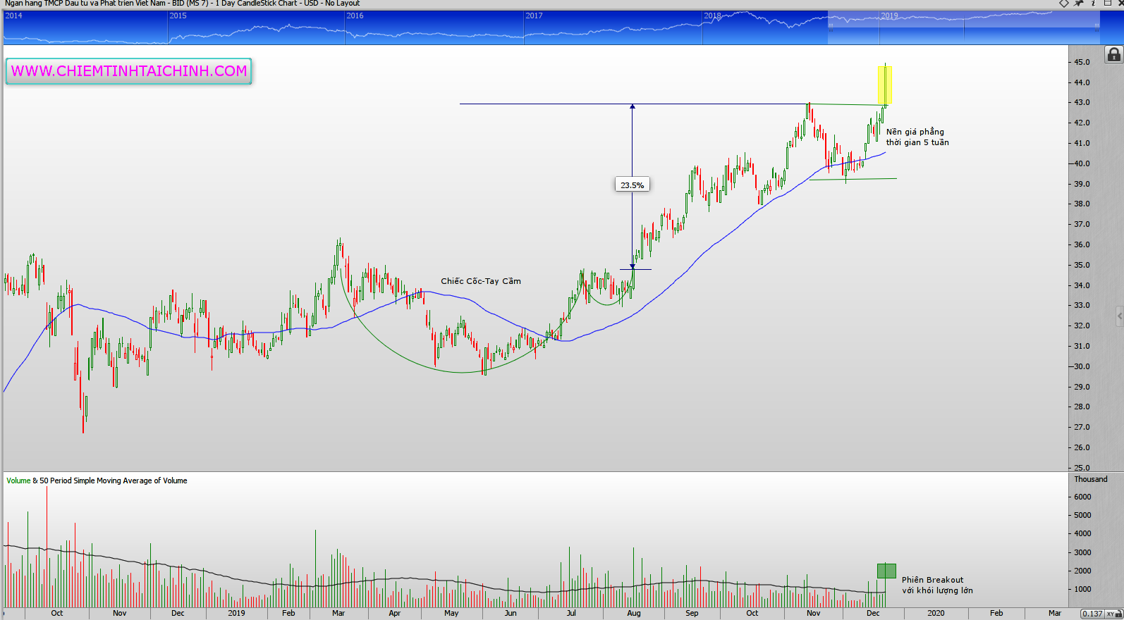 Cổ phiếu BID trở thành tâm điểm của ngày hôm nay bằng phiên breakout khỏi Nền Giá Phẳng (Flat Base) với thời gian hình thành 5 tuần. RS (Sức Mạnh Giá) của BID là 88. Nên nhớ trong điều kiện thị trường yếu, xác suất bị pullback sau điểm breakout là khoảng 67%.