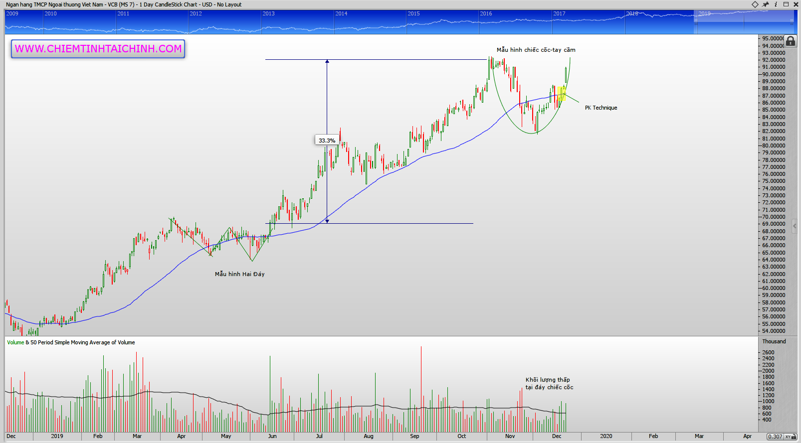 VCB sau điểm mua PK Technique vẫn đang tiếp tục tăng giá. Khả năng chúng tôi kỳ vọng sự xuất hiện của mẫu hình chiếc cốc (có hoặc không có tay cầm). RS (Sức Mạnh Giá) của VCB là 85.