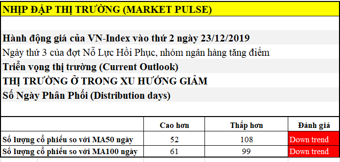 Số lượng các mã cổ phiếu nằm dưới MA50 ngày vẫn chỉ bằng một nửa so với số mã nằm trên MA50 ngày. Điều này cho thấy vẫn chưa nhiều con ngựa chịu kéo VN-Index. Đây là ngày 3 của Đợt Nỗ Lực Hồi Phục và tín hiệu hành động giá vẫn yếu ớt. Nhà đầu tư chờ đợi sự xuất hiện của Ngày Bùng Nổ Theo Đà thường xuất hiện ở ngày 4 đến ngày 7 của đợt Nỗ Lực Hồi Phục để đưa thị trường trở về trạng thái “xu hướng tăng được xác nhận”.
