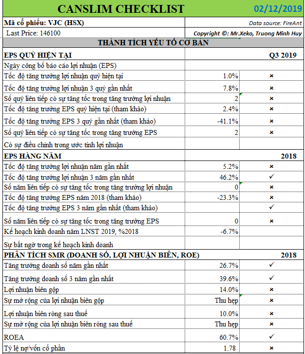 - Kiểm tra CANSLIM cho thấy, ROE đạt mức cao. Tỷ lệ nợ có lãi (ngắn hạn+dài hạn)/vốn chủ sở hữu tầm 50%. Trong đó, nợ có lãi ngắn hạn chiếm 89% tổng nợ (có lãi và nợ chiếm dụng). Hệ số thanh toán hiện hành là 1.3 lần. Như vậy, Vietjet vẫn đang ở mức an toàn về vấn đề tài chính.