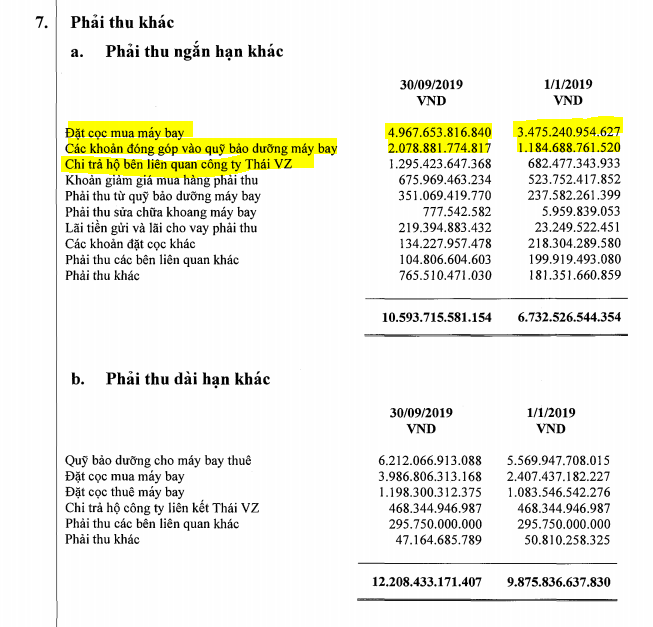 - “Theo các điều khoản của hợp đồng thuê hoạt động máy bay, Tập Đoàn có nghĩa vụ về mặt pháp lý và nghãi vụ theo hợp đồng đối với hoạt động bảo dưỡng và sửa chữa máy bay trong suốt thời gian thuê và phải đóng góp các khoản quỹ bảo dưỡng máy bay cho bên cho thuê máy bay. Quỹ bảo dưỡng được ghi nhận như là phải thu ngắn hạn và phải thu dài hạn khác khi không có sự không chắc chắn đáng kể về khả năng nhận được các khoản hoàn trả từ bên cho thuê máy bay. Các khoản đóng góp cho quỹ bảo dưỡng được tính toán dựa trên hiệu suất hoạt động, như giờ bay hoặc số lần cắt cánh hạ cánh và phải hoàn trả theo hợp đồng cho Tập đoàn khi tập đoàn hoàn thành hoạt động bão dưỡng bắt buộc cho máy bay thuê bao gồm thay thế các bộ phận có thời gian sử dụng giới hạn, phục hồi hiệu suất động cơ, kiểm tra cấu trúc chính của khung máy bay, đại tu bộ phậ hạ cánh và sửa chữa lớn APU ( thiết bị cung cấp năng lượng phụ trợ). Phần còn lại của quỹ bảo dưỡng khi kết thúc thời hạn thuê sẽ thuộc quyền sở hữu của bên cho thuê máy bay”. Nguyên nhân khác khiến cho lượng tiền mặt của VJC bị âm là mua cổ phiếu quỹ. Công ty đã chi hơn 2,300 tỷ đồng để mua cổ phiếu quỹ vào tháng 8/2019.