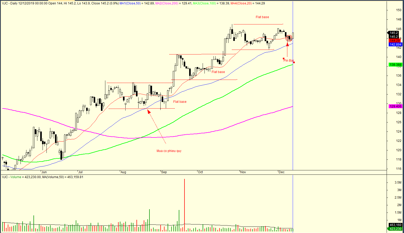 Chúng tôi vẫn tiếp tục theo dõi các cổ phiếu có RS (Sức Mạnh Giá) cao và vượt trội so với thị trường, đang hình thành nền giá. Danh sách này được cập nhật liên tục trong Room dành cho học viên Trend Trader. Chúng tôi giới thiệu một trong các mã cổ phiếu đó như VJC. VJC có RS bằng 74. Trong khi thị trường chung giảm điểm thì VJC liên tục tăng cao hơn và xây các nền giá phẳng chồng trên nhau nhờ hiệu ứng mua 17 triệu cổ phiếu quỹ (chữ S trong CANSLIM)