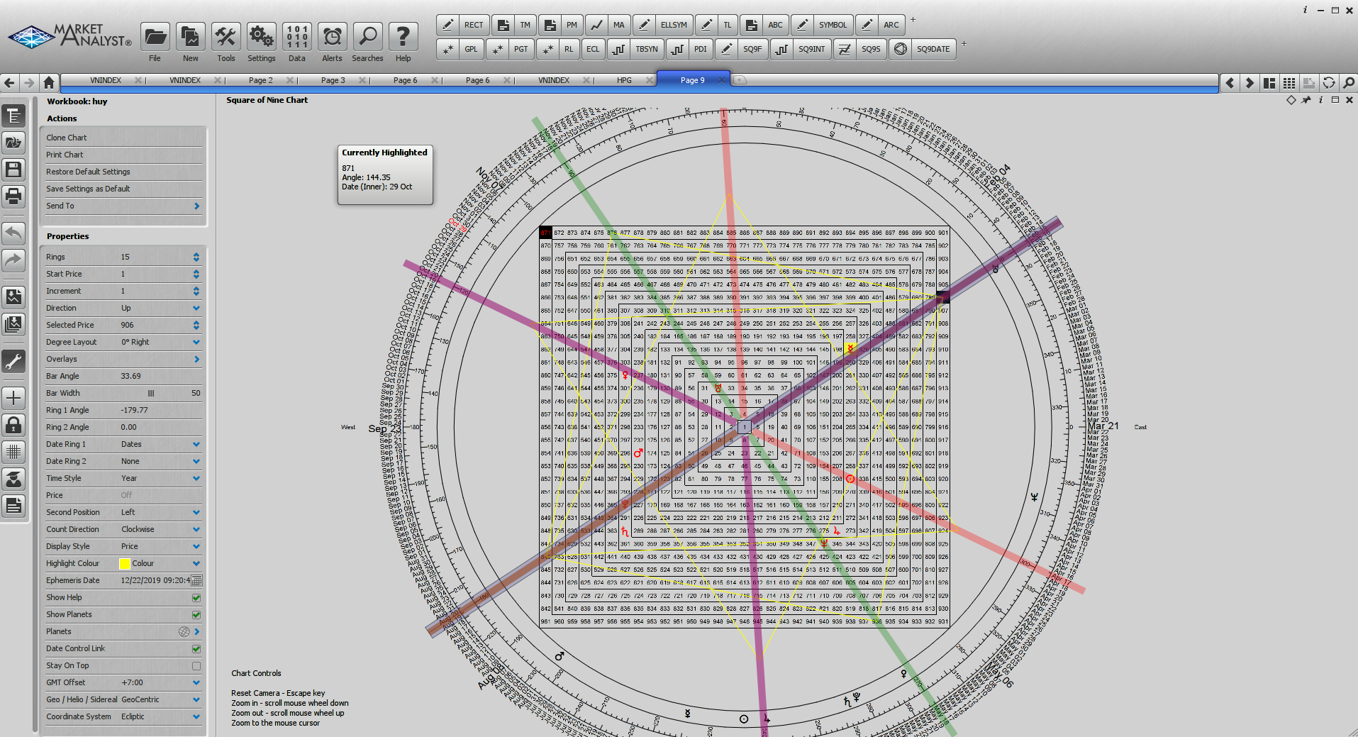 Tôi đã kiểm tra trên Gann square of 9. Mức 945 điểm hoàn toàn đối ngược với ngày 20.12.2019. Vị trí của Uranus cũng tao góc 120 độ (trine) với mức 945 điểm (Venus square Uranus vào ngày 22/12/2019). Điều này tạo nên sự cân bằng giữa giá và thời gian.