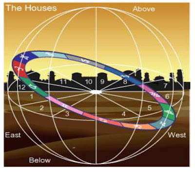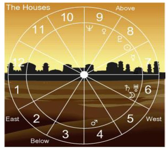 Chúng ta biết rằng các Cung (signs) là những phần cố định trên bầu trời, giống như chia đều một chiếc bánh piza. Trong khi đó, Nhà (houses) cũng là các phần được chia trên bầu trời nhưng theo vị trí và thời gian mà bạn sinh ra. Chúng ta cũng có 12 Nhà. Khi các hành tinh xuất hiện trên các cung, nó cũng xuất hiện trên các Nhà. Biểu đồ dưới là 12 Nhà và các hành tinh nằm trong đó.