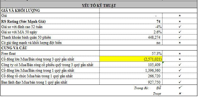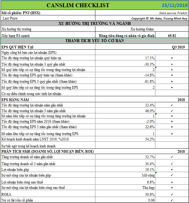 Bảng kiểm tra CANSLIM Checklist cho thấy có 2 quý tăng tốc trong tăng trưởng lợi nhuận trong 3 quý gần đây. PNJ là cổ phiếu có ROE cao với tỷ lệ nợ thấp. Đáng chú ý, trong 1 quý gần đây, ban lãnh đạo PNJ đang gom vào gần 1 triệu cổ phiếu (mua theo chương trình ESOP với giá ưu đãi). Đây chính là chữ I trong CANSLIM. Việc ban lãnh đạo gom hàng trong khi PNJ đang xây nền giá dạng VCP là một tín hiệu tích cực.