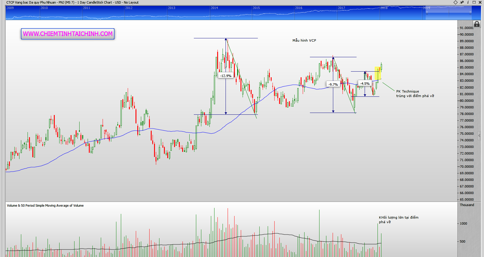 Tiêu điểm ngày hôm nay là PNJ. Cổ phiếu PNJ có mẫu hình VCP với ba lần thu hẹp. ĐIểm phá vỡ trùng với Pk Technique đi kèm khối lượng lớn. RS (Sức Mạnh Giá) của PNJ là 74.