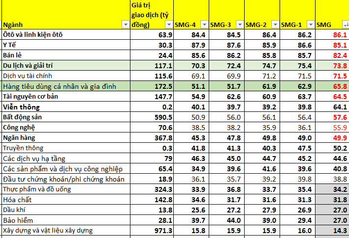 Bảng RS (Sức Mạnh Giá) theo ngành cho thấy ngành Hàng Tiêu Dùng Cá Nhân và Gia Đình (PNJ được phân vào nhóm ngành này) đang là ngành có RS cao trong những ngành có giá trị giao dịch lớn.