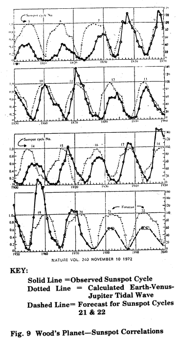 Phát triển mới nhất của lý thuyết mẫu hình vệt đen mặt trời được công bố trong số ra ngày 10 tháng 11 năm 1972 của tạp chí khoa học quốc tế Nature, của K.D.Wood tại Khoa Học Kỹ Thuật Không Gian Vũ Trụ, Đại học Colorado, Boulderm, Colorado. Wood cho Thủy Tinh, Kim Tinh, Trái Đất và Mộc Tinh là “các hành tinh thủy triều” và các đường cong thể hiện (Hình 9) cho thấy tương quan cao giữa chiều dài chu kỳ trung bình của vệt đen mặt trời là 11.05 năm với thủy triều hành tinh là 11.08 năm trong giai đoạn 1800-2000. Đỉnh của hai chu kỳ vệt đen mặt trời tiếp theo được dự báo xuất hiện vào năm 1982.0 và 1993.4, với “sai số có thể là ít hơn một năm.” Phụ lục 3 trình bày các bảng so sánh ngày đỉnh vệt đen mặt trời với ngày của đỉnh dao động thủy triều của các hành tinh.