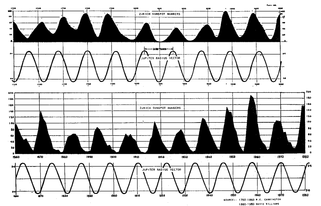 “Tôi cố ý đi ngược lại đường cong vệt đen mặt trời, những thay đổi véc tơ bán kính của Mộc Tinh, nhằm có được một thước đo duy nhất. Nó cho thấy từ năm 1770, có sự đồng bộ giữa cực đỉnh tần suất và cực đỉnh véc tơ bán kính Mộc Tinh, và giữa cực tiểu này với cực tiểu khác, nhưng với khác biệt mơ hồ như vậy đã làm nảy sinh nhiều nghi ngờ đối với bất cứ kết luận vội vàng về liên kết vật lý nói trên. Trong hai giai đoạn trước năm 1770, vẫn có sự phù hợp như vậy mặc dù dữ liệu tuần suất không chắc chắn cho giai đoạn này, nhưng dạng đường cong chuẩn của giáo sư Wolf có thể là quá tốt để thừa nhận bất cứ những đảo ngược như vậy. Trong trường hợp này, mặc dù không đáp ứng mục tiêu của chúng tôi, nhưng thật quan trọng khi thấy có một trường hợp trong đó tám trường hợp liên tiếp không đồng ý nhưng chưa hoàn hảo giữa những thay đổi của hai hiện tượng vật lý được thể hiện không đầy đủ để có được bất cứ kết luận nào, lúc này, chúng đòi hỏi phải có thêm nhiều nghiên cứu sâu hơn về quan điểm cho rằng liệu sự khác biệt này có thể được chấp nhận nhằm dự báo tương lai.”
