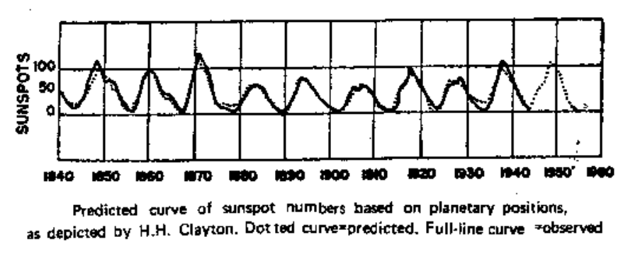Vào năm 1935, Clayton xây dựng một đường cong dựa trên các khoảng thời gian trung bình của Thổ Tinh, Mộc Tinh, Kim Tinh, Thủy Tinh và Trái Đất từ đó ông đưa ra dự báo chính xác về đỉnh của vệt đen mặt trời vào năm 1937. Ông tính khoảng thời gian trung bình của các cặp hành tinh khi chúng có khoảng cách xa nhất so với xích đạo trái đất và phát hiện thấy có hai yếu tố ảnh hưởng lớn nhất đến việc tạo nên vệt đen mặt trời là sự giao hội của Mộc Tinh-Thổ Tinh và Kim Tinh-Thủy Tinh. Vào năm 1943, ông cho rằng lý do có thể là vì Mộc Tinh và Thổ Tinh là hai hành tinh lớn nhất trong khi Thủy Tinh và Kim Tinh là hai hành tinh gần mặt trời nhất.