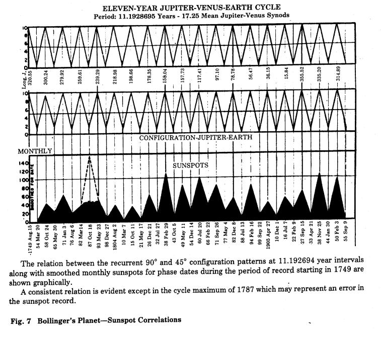 Vào năm 1953, giáo sư C.J.Bollinger của Đại học Oklahoma, trong Bản Đồ Thời Tiết Mặt Trời Theo Các Hành Tinh (Atlas of Planetary Solar Climate), xây dựng một đường cong (hình 7) thể hiện sự tương quan thích hợp giữa chu kỳ 11.19 năm của vệt đen mặt trời với chu kỳ tương tự được tạo bởi các góc 0 độ, 45 độ và 90 độ của Mộc Tinh-Kim Tinh-Trái Đất trong giai đoạn 1749-1955. (Điều này gợi nhớ lại vào năm 1867, giáo sư Norton của Yale nói: “Các hành tinh có ảnh hưởng lớn nhất là Mộc Tinh và Kim Tinh).
