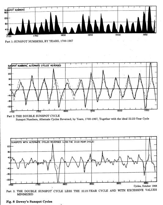 Hình 8, Phần 1 minh họa chu kỳ 11.11 năm truyền thống; Phần 2 minh họa Chu kỳ vệt đen mặt trời gấp đôi (22.22 năm) trong đó chu kỳ hoán đổi của Phần 1 bị đảo ngược; Phần 3 minh họa Chu Kỳ Vệt Đen Mặt Trời Gấp Đôi, ít hơn chu kỳ 22.22 năm và với giá trị dư thừa tối thiểu, cho thấy “một chu kỳ điều hòa, chi phối, rõ ràng khoảng 18 năm (chiều dài chính xác là vào khoảng 17.93 hoặc 17.94 năm).” Phụ lục 2 minh họa kết quả của “Thăm Dò Khoảng Thời Gian Hệ Thống của Số Lượng Vệt Đen Mặt Trời từ 1700-1965” do Dewey thực hiện. (Thăm dò một khoản thời gian hệ thống bao gồm việc làm khớp với dữ liệu nhiều chu kỳ để nhận thấy chu kỳ nào là mạnh nhất, về trung bình, và do đó chắc chắn là kết quả của lực chu kỳ thực tế.)