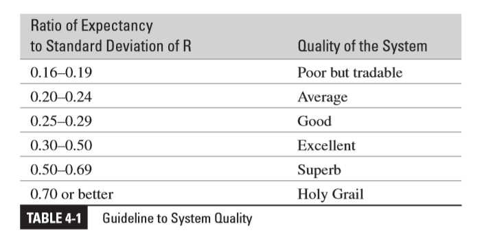 Mục tiêu của hệ thống giao dịch là giúp bạn có thể đạt được mục tiêu dễ dàng thông qua việc xác định quy mô vị thế giao dịch. Nếu bạn quan sát tỷ số giữa kỳ vọng và độ lệch chuẩn của phân phối Bội Số R mà hệ thống tạo ra, nói chung bạn sẽ dễ dàng nhận ra CHẤT LƯỢNG HỆ THỐNG (QUALITY OF THE SYSTEM) và cách thức mà hệ thống đạt được mục tiêu bằng thuật toán xác định quy mô vị thế giao dịch. Bảng 4.1 là một hướng dẫn cứng mà bạn nên tuân thủ.