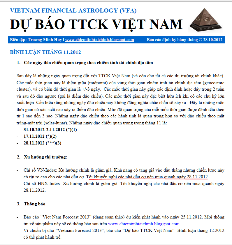 Tôi viết trong báo cáo VFA_Dự Báo TTCK Việt Nam_Bình luận tháng 11.2012 (ra ngày 28.10.2012) và tháng 12.2012 (ra ngày 1.12.2012): “Sau xu hướng giảm mạnh trong tháng 11, tôi kỳ vọng khả năng tạo đáy quanh ngày xảy ra hiện tượng nguyệt thực nửa tối 28.11.2012 (Cụ thể là +/- 3 ngày giao dịch hoặc thậm chí thu hẹp hơn là +/-1 ngày giao dịch…Mặc dù tôi không khẳng định đây là đáy dài hạn của thị trường nhưng chiến lược mua quanh ngày 28.11.2012 là an toàn cho các nhà đầu cơ.”