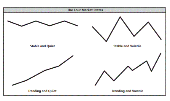 Theo Curtis Faith (2007), triết lý của trading của nhóm con rùa (Turtle) không phải là đi dự báo thị trường mà thay vào đó là tìm ra những chỉ báo để xác định tình trạng của thị trường. Đây là khái niệm quan trọng. Các Turtle không quan tâm đến đúng sai, họ quan tâm đến việc kiếm tiền. Các trader giỏi không cố gắng dự báo thị trường mà họ tìm kiếm các chỉ báo xem thị trường đang làm gì. Do đó, nhóm Turtle sử dụng chỉ báo ATR của Wilder (họ gọi là N) để phân loại thị trường. Có 4 loại thị trường theo quan điểm của nhóm.