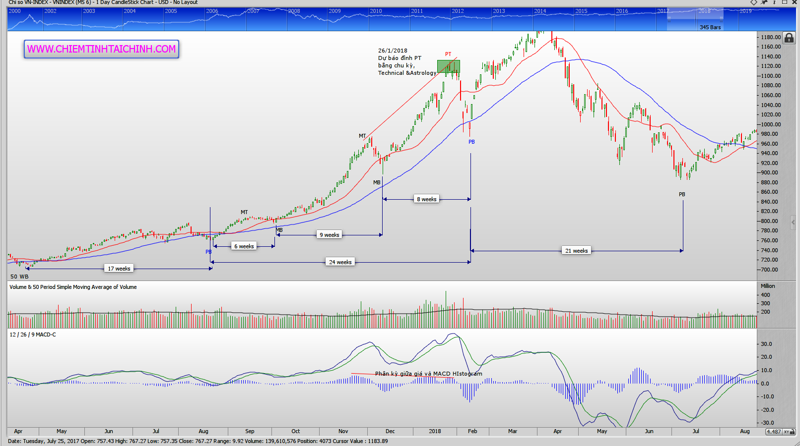 - Dấu hiệu chu kỳ: Vào ngày 8.1.2018, tôi nhận thấy VN-Index có hai lần thủng xuống dưới MA20 ngày và đánh dấu đó là MB. Lần MB đầu tiên có chiều dài 6 tuần, lần MB thứ hai có chiều dài 9 tuần. Như vậy, đã hơn 17 tuần trôi qua kể từ đáy PB vào ngày 23/8/2017. Đây là lúc tìm kiếm đỉnh PT.