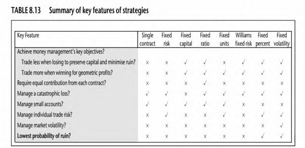 Trong cuốn sách tuyệt vời của Brent Penfold, có tên “The Universal Principles of Successful Trading“, ông đã thực hiện kiểm tra đáp ứng các mục tiêu quản trị tiền của một số phương pháp phổ biến.