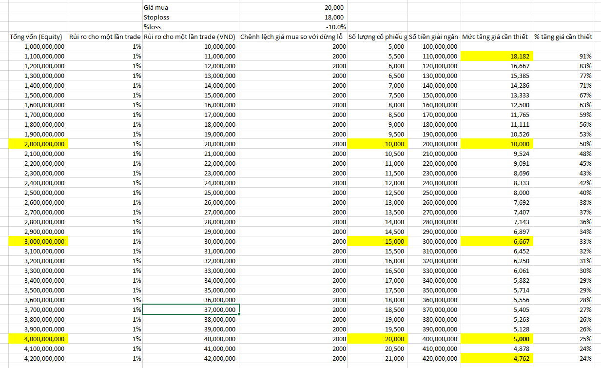 Bạn thấy đấy, với 1 tỷ đồng, và rủi ro cho 1 lần giao dịch là 1%, bạn sẽ sẵn lòng mất 10 triệu đồng nếu như giao dịch này lỗ. Với chênh lệch giá mua và stoploss là 2,000 đồng, đại diện cho rủi ro cho một lần giao dịch, thì bạn sẽ mua 5,000 cổ phiếu. Số tiền giải ngân là 5,000 x 20,000 = 100 triệu đồng.