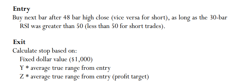 Tín hiệu mua: mua ở thanh giá tiếp theo sau thanh giá vượt đỉnh 48 thanh giá, cùng lúc RSI của 30 thanh giá lớn 50. Đảo ngược lại cho tín hiệu bán.