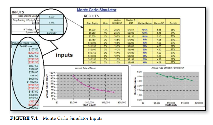 Trong đó, tỷ lệ fractional là tỷ lệ so với quy mô tài khoản mà bạn đặt cược rủi ro cho một lần giao dịch. Một lần nữa, mô phỏng Monte Cargo giúp bạn chọn ra tỷ lệ Fractional tốt nhất. Các biến số đầu vào như tỷ suất sinh lợi trung vị, tỷ suất sinh lợi/drawdown nên càng cao càng tốt, trong khi nên sử dụng các max drawdown thấp.