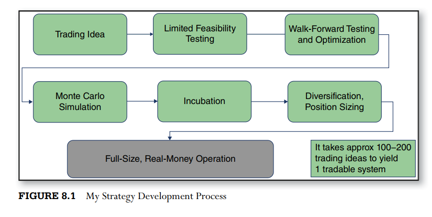Sau đó bạn mới tìm kiếm các ý tưởng giao dịch. Là các quy tắc giao dịch mà bạn đọc được. Kevin giới thiệu một số quy tắc giao dịch ở cuốn sách dưới. Chọn khoảng thời gian dữ liệu để test là vấn đề quan trọng. Nói chung các dữ liệu 5-10 năm thường không sẵn có để test. Kevin đề nghị nên có tối thiểu 30-100 giao dịch để bắt đầu kiểm tra một chiến lược. Kevin ưa thích có khoảng 120-400 giao dịch.