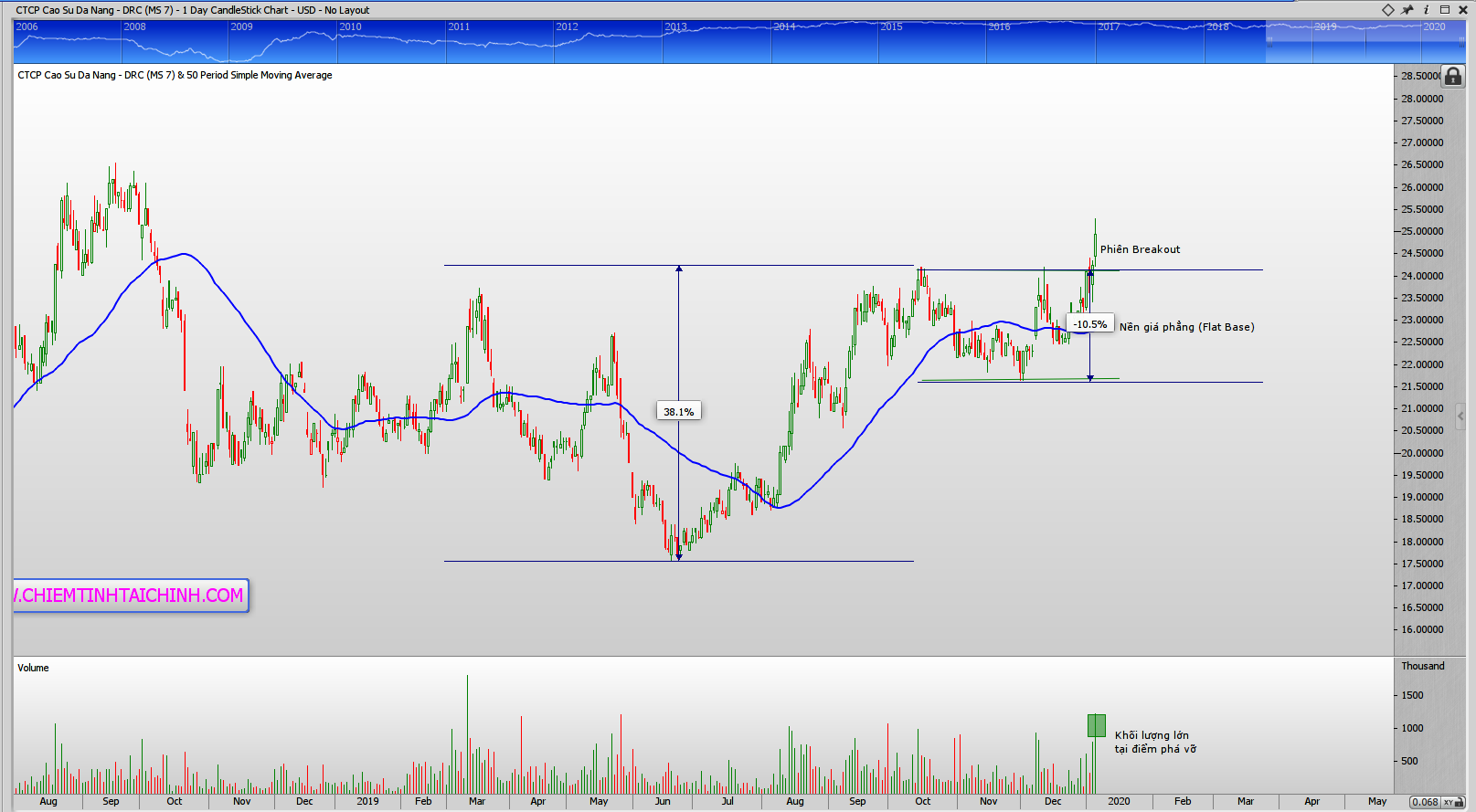 DRC hôm nay có điểm breakout (phá vỡ) từ mẫu hình Nền Giá Phẳng (Flat Base). Độ sâu của nền giá là -10.5%. Đây là nền giá đầu tiên. ĐIểm phá vỡ đi kèm khối lượng lớn. Xem lại phân tích cơ bản về DRC dưới đây.