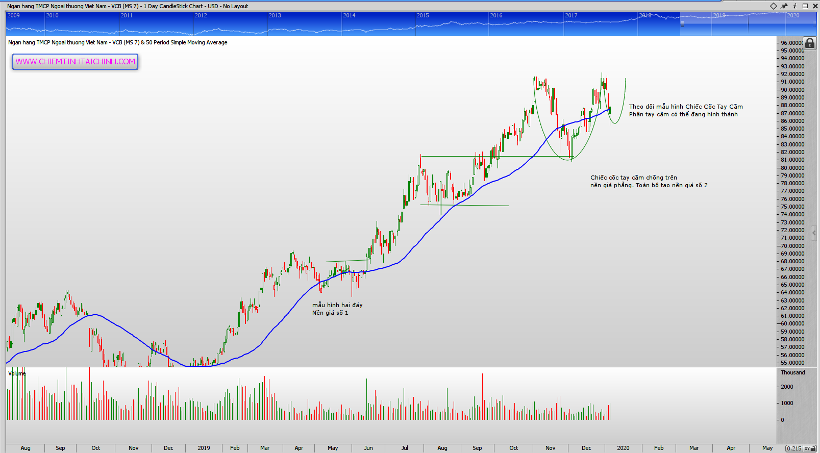 Sự hồi phục của nhóm ngành ngân hàng là điều tôi đang kỳ vọng trong bản tin tuần. Phần tay cầm của VCB đang hình thành với khối lượng thấp. Phiên giao dịch ngày 7/1/2020, VCB tăng giá để giữ đường MA50 ngày với khối lượng cao hơn các phiên trước. Đây là dấu hiệu cho thấy các nhà đầu tư lớn đang muốn giữ giá VCB.