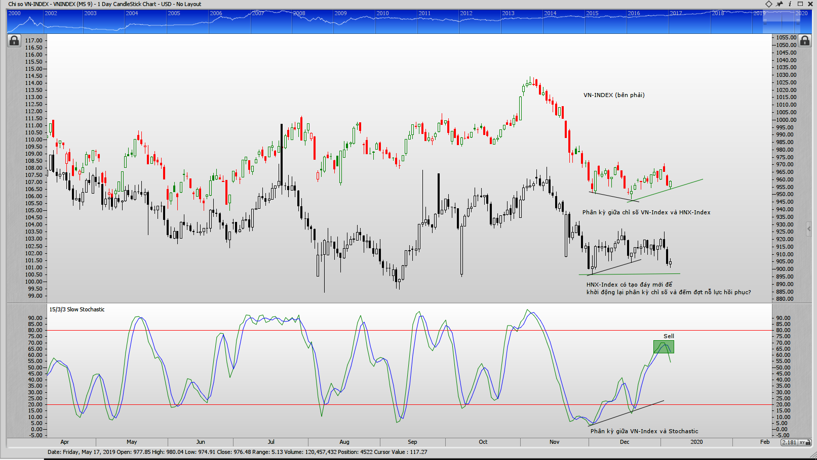 Như đề cập trong bản tin Nhìn Lại Tuần Qua,3.1.2020, khả năng một trong hai chỉ số VN-Index hoặc HNX-Index sẽ giảm và tạo đáy mới để khởi động lại việc đếm nền giá và tạo phân kỳ giữa các chỉ số. Tình hình hiện tại cho thấy HNX-Index đang ở gần đáy cũ hơn so với VN-Index. Do đó, khả năng HNX-Index kiểm tra hoặc phá thủng đáy cũ cao hơn VN-Index. Chỉ số VN-Index có tín hiệu bán từ Stochastic Oscillator.
