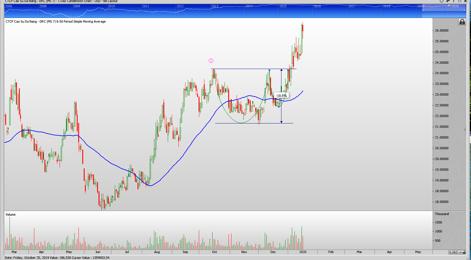 Cổ phiếu DRC tiếp tục tăng giá thiết lập đỉnh cao mới với khối lượng cao hơn phiên trước. DRC đã có điểm breakout từ Nền Giá Phẳng.
