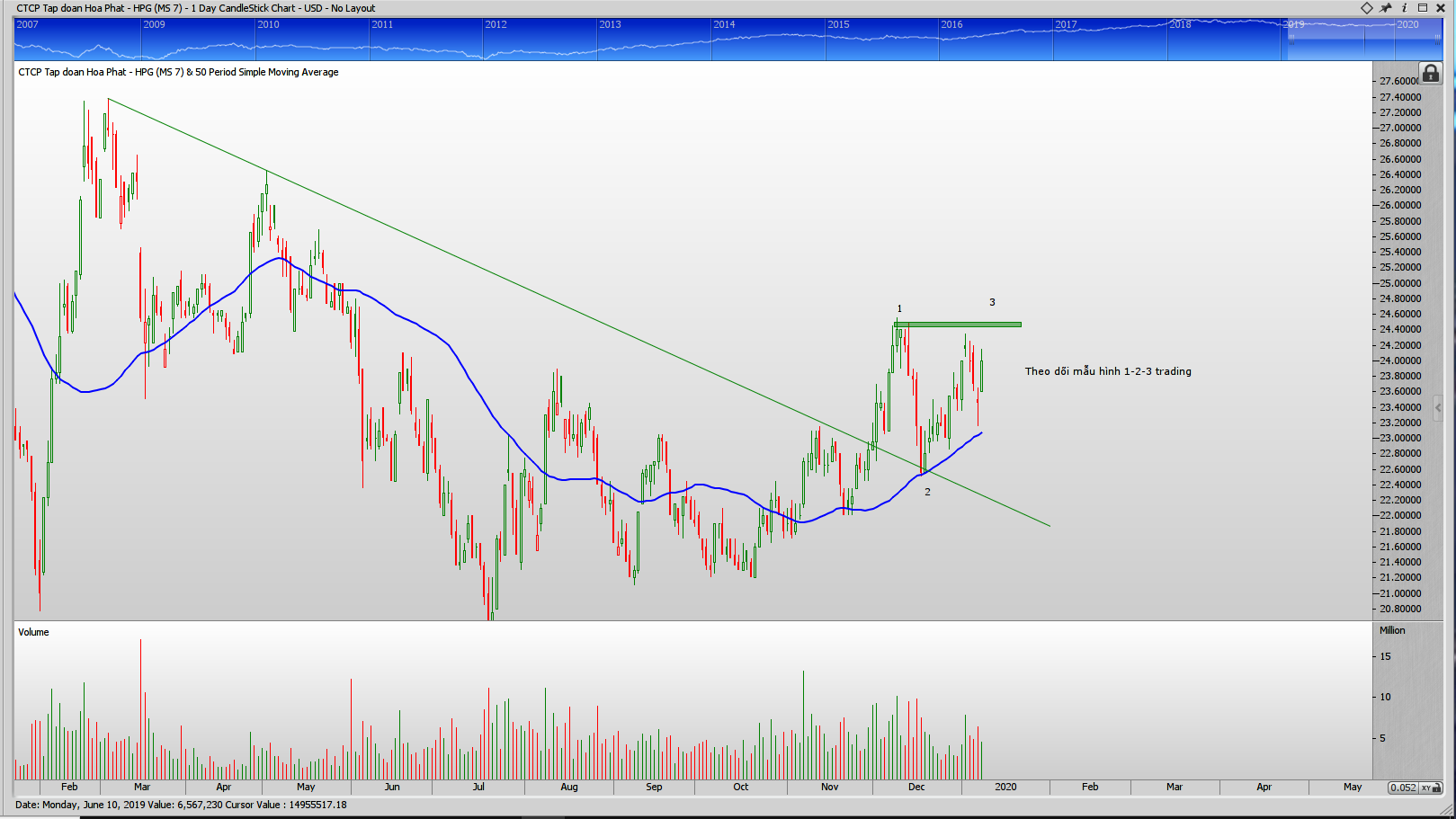 Cổ phiếu HPG vẫn đang tiến gần đến điểm breakout của mẫu hình 1-2-3 trading.