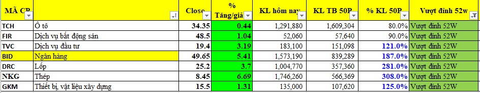 Danh sách cổ phiếu vượt đỉnh 52 tuần bắt đầu mở rộng nhẹ trở lại. Dòng cổ phiếu ngân hàng như BID, thép như NKG đã thiết lập đỉnh 52 tuần. Đây là hai nhóm ngành tôi kỳ vọng sẽ tạo sóng trong thời gian tới.