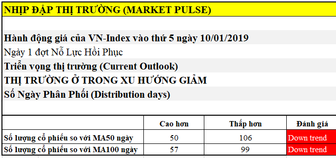 Chỉ số VN-Index có phiên tăng điểm mạnh hơn 1.18% nhưng thanh khoản thấp hơn phiên trước. Đây là ngày 1 của Đợt Nỗ Lực Hồi Phục sau khi VN-Index thiết lập đáy mới. Chúng tôi chờ đợi sự xuất hiện của ngày Bùng Nổ Theo Đà, thường xuất hiện ở ngày 4 đến ngày 7 của đợt Nỗ Lực Hồi Phục, để đưa thị trường trở lại xu hướng tăng.