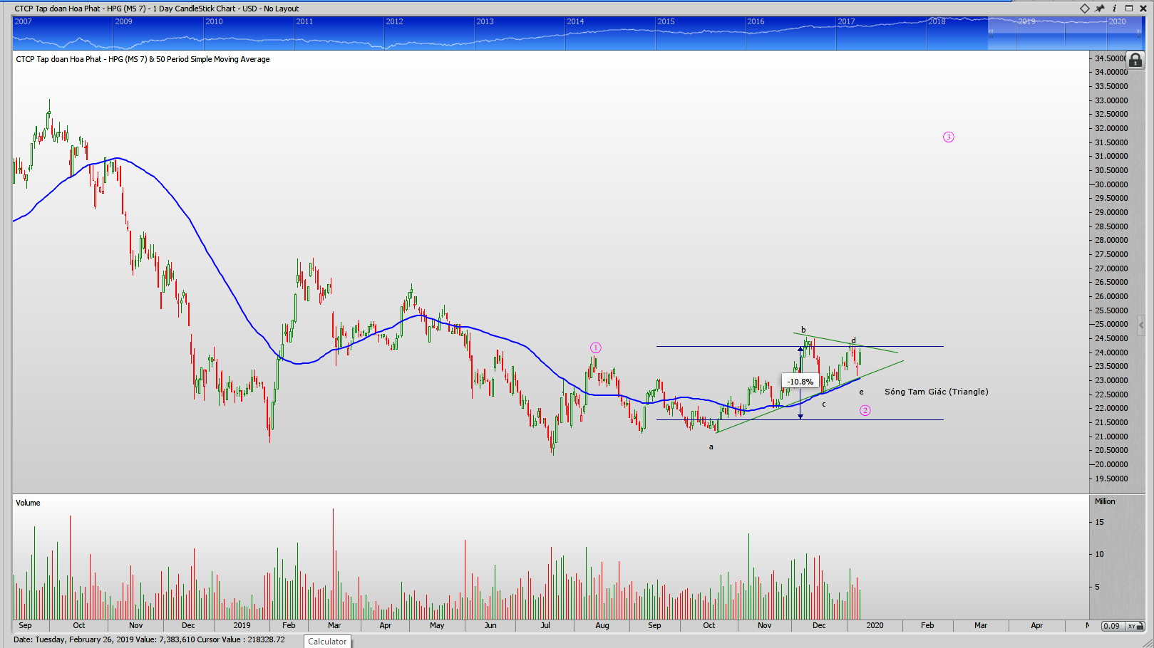 HPG đang có dạng sóng tam giác ở sóng 2 (vòng tròn). Tôi nhìn thấy có đủ cấu trúc từ a đến e. Nếu chuyển sang sóng 3 (vòng tròn) thì đó là sóng tăng mạnh theo tuyệt chiêu “Kiếm Đâm” trong sóng Elliott.